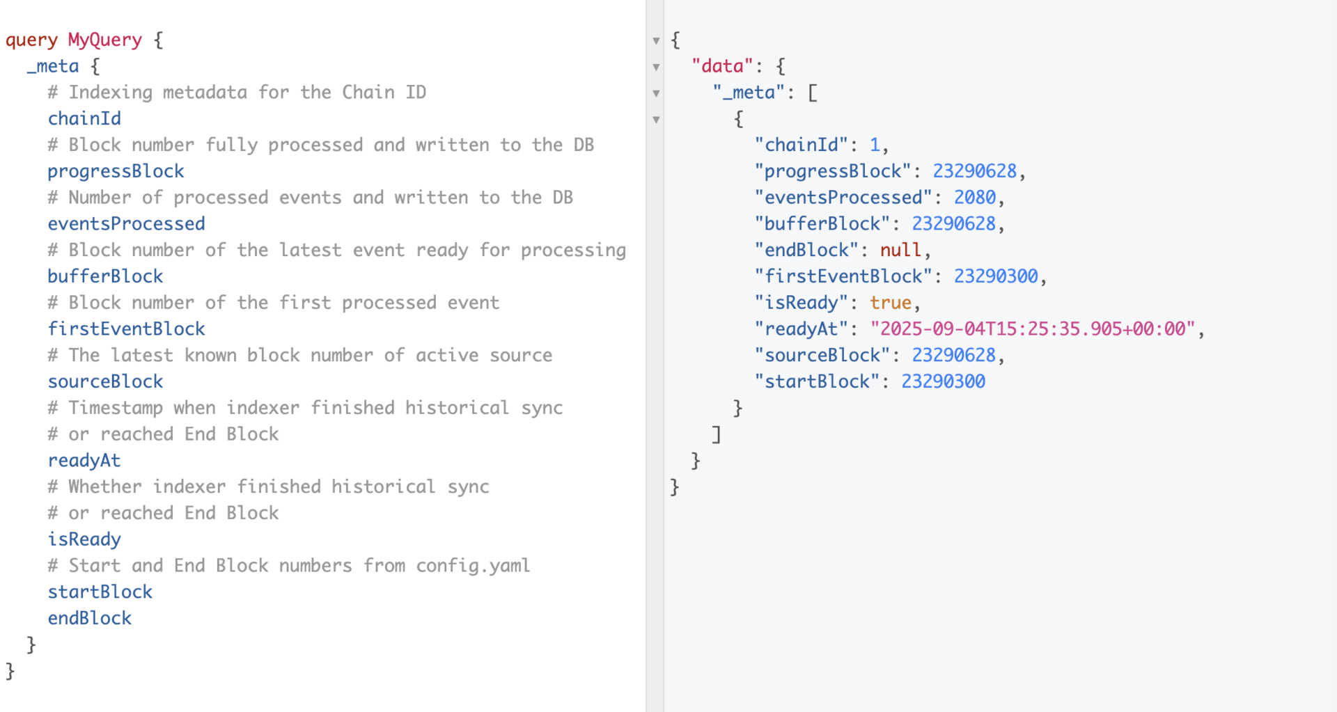 HyperIndex now exposes an official _meta query that returns indexing metadata per chain, making it simple to monitor progress and track sync status.