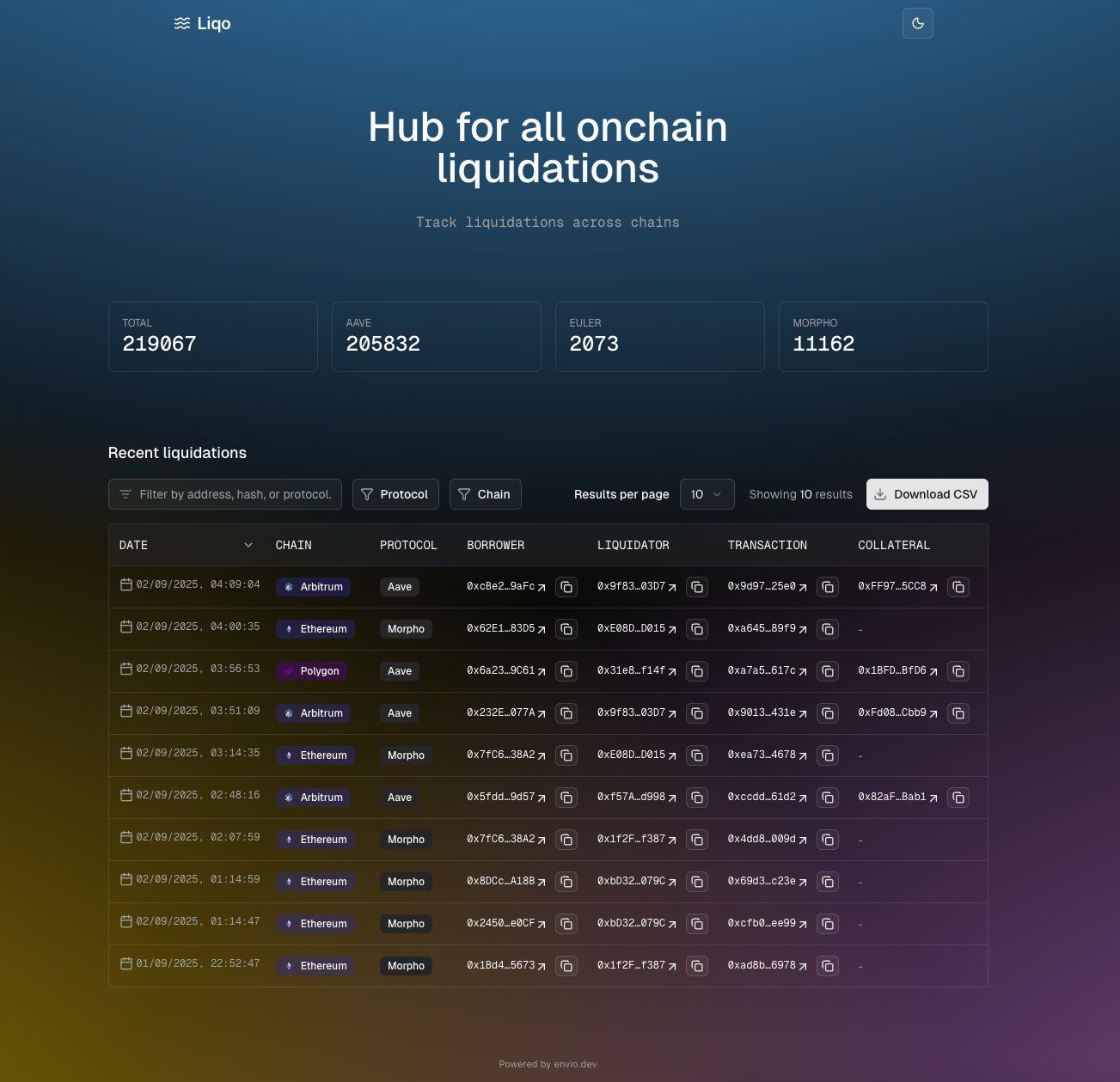 Track major real-time liquidations in style with Liqo, a powerful liquidation leaderboard tool powered by Envio. The new leaderboard gives you a clear view of the most active liquidators across top protocols like Aave, Morpho, and Euler, with support for Twyne coming soon.